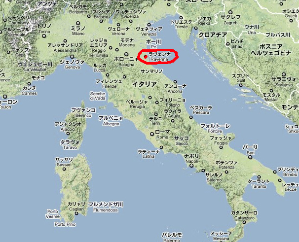 ラヴェンナの場所は下の地図の赤く囲ったところです。