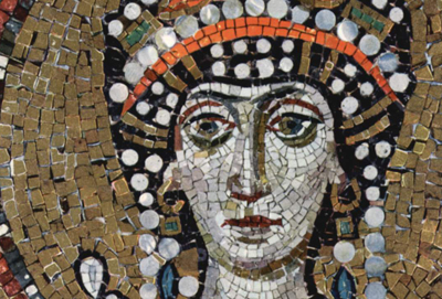 下の絵は、皇后テオドラの顔の部分を拡大したものです。石の「ドット」がよく分かりますね。