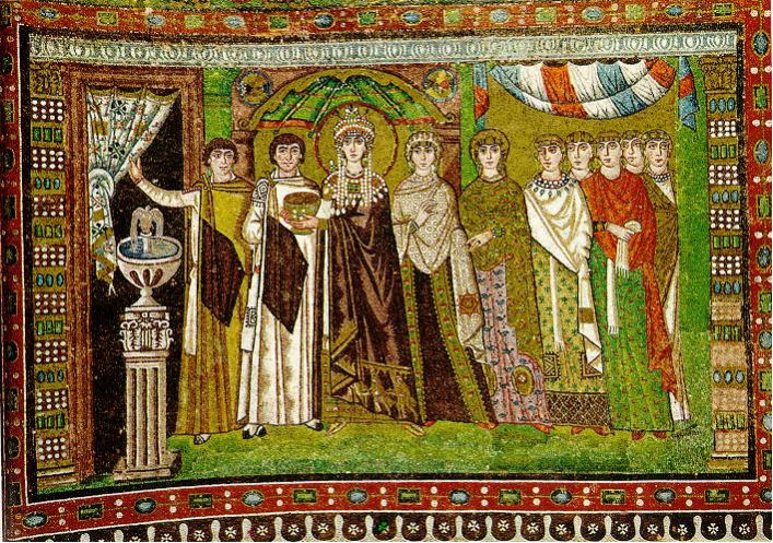 皇帝ユスティニアヌス1世と廷臣たち、皇后テオドラと侍女たちをはじめとする