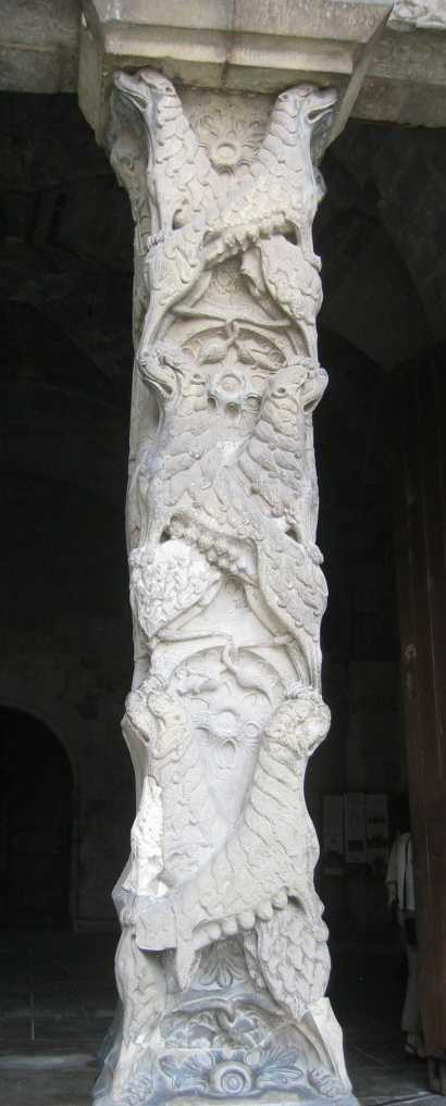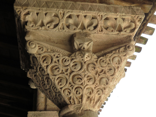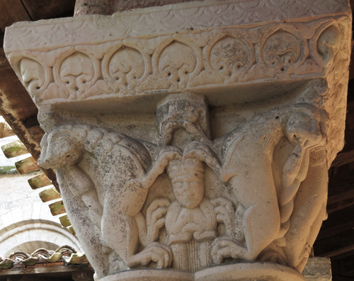 柱頭彫刻は、純粋に装飾的なものと、聖書的主題が交替して並んでいます。