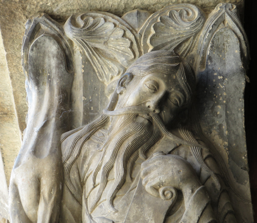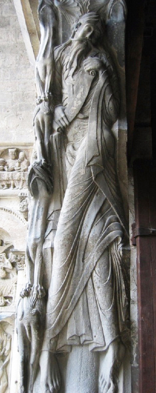 柱の長方形枠にうまく適応し、流れるような髪と長い髭、憂いのある瞳で、首を少し傾げ,