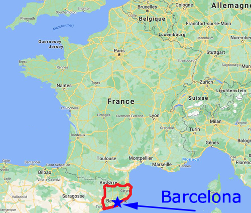 青い矢印と青い星印で示したところがバルセロナ(Barcelona)です。