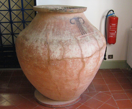 右の写真のカメは高さが1メートル以上あって、上部に渦巻き文様が描かれています。