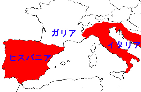 これを見れば分かるとおり、イタリアとイベリア半島(ヒスパニア)の間には