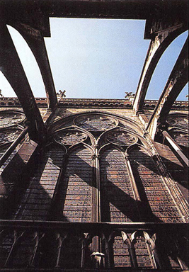 | リブ・ヴォールトの発明は正方形システムからの脱却を可能とし、一様に尖頭アーチを用いさせるに至った。同時に壁体は大きく解体され、支柱と骨組み部材による構造システムに取って代られた。壁のあった場所は大きな窓面に変わった。押し出された壁体の量塊は外部の控柱や控アーチに姿を変えた。このような構造システムが形成された結果、各部分空間の空間的統一が実現した。ロマネスクの時代に対比してみると、ここでは建築は無重量感、超物質感といった性格を得た。これはローマ建築に対する初期キリスト教建築およびビザンチン建築の関係に似ているが、ただここでは、高さが著しく大きくなったために、古代における比例感覚の最後の残滓までも消え失せた。 (F.バウムガルト『西洋建築様式史(上)』杉本俊多訳、鹿島出版会、1983年、162頁) |
