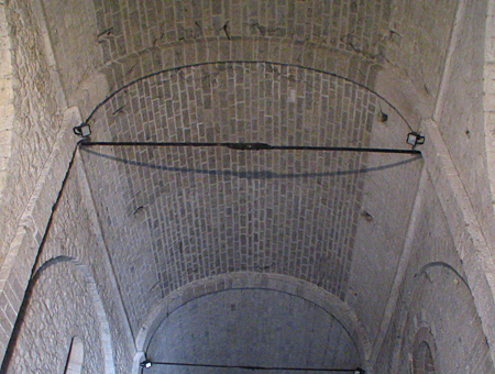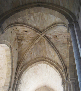 下の写真(↓)は、左側がロマネスクの教会の天井で、いわゆる「半円筒形トンネル・ボールト」です。