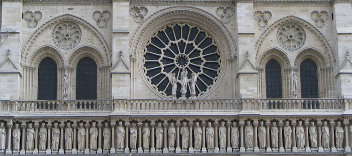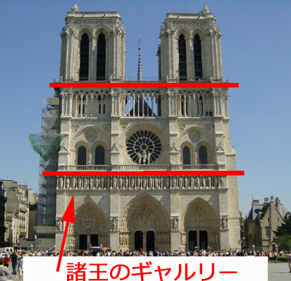 横に連なる「諸王のギャルリー」(Galerie des Rois)の上部の水平線と、双塔の基部の水平線が、