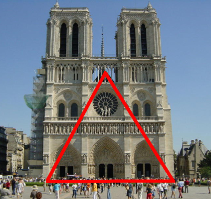 中央のバラ窓を頂点とし、下に並ぶ左右の扉口の底辺の両端を結ぶ「三角形」が、