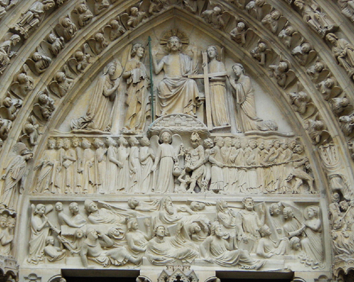タンパン外周の4列からなるアーチ形曲線は、天使と王と族長のいる天の王宮を表します。