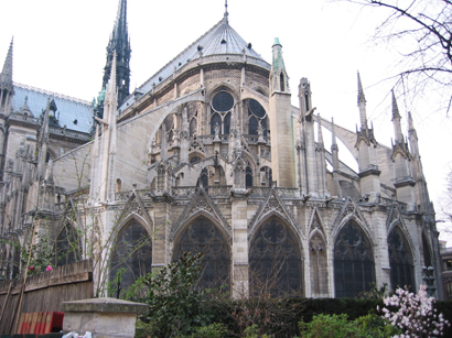 右側は、パリのノートルダム大聖堂(ゴシック)の後ろの、後陣側からの眺めです。