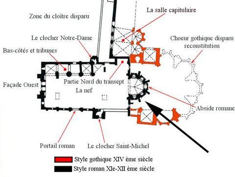 その後、14世紀に赤い部分を増築して、黒いロマネスク期の後陣(黒い矢印で示した部分)を