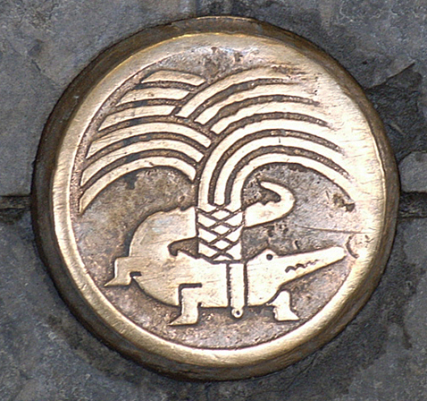 市内のあちこちには、路面にやはりワニをあしらったメダル(写真下の左)がはめ込まれています。