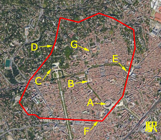 下の地図の赤い線で表したのが古代ニームの都市城壁です。