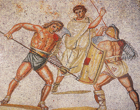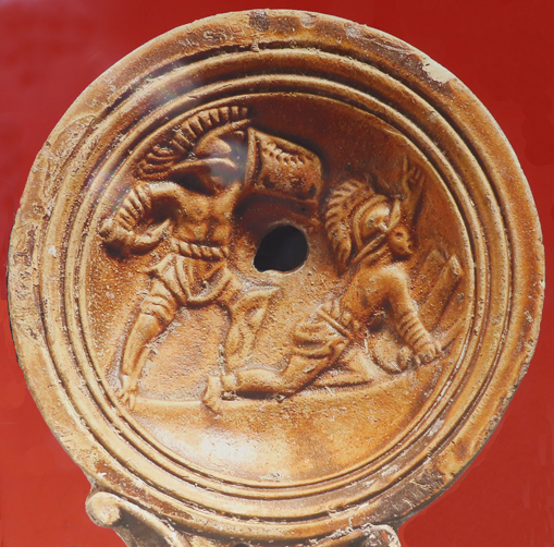 古代の剣闘士たちの戦いを描いたモザイク画(3世紀) 敗者にとどめを刺す勝者。陶器製のランプ(紀元1世紀)
